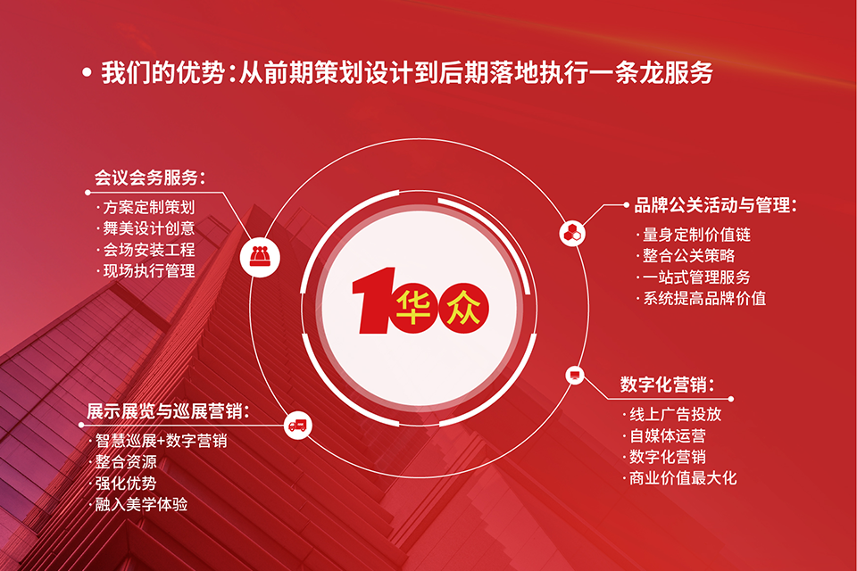 華眾傳媒集團是在大數(shù)據(jù)網(wǎng)絡(luò)和新消費交互時代為企業(yè)及其品牌全面賦能的營銷戰(zhàn)略公關(guān)公司。華眾傳媒集團成立于2006年,總部設(shè)在青島,在北京、上海、廣州建立分公司,公司云集數(shù)百名公關(guān)、數(shù)字、營銷、設(shè)計等業(yè)界精英人才,旗下隸屬分公司有:北京華友世紀文化傳媒有限公司、上海天諾盛世廣告策劃有限公司和青島華和影視文化傳媒有限公司等多家子公司。公司積累了豐富的數(shù)字媒體、政府、時尚、圈層KOL等行業(yè)資源,服務(wù)項目輻射全國。業(yè)務(wù)范圍包含品牌公關(guān)活動與管理、數(shù)字化營銷、自媒體運營、影視傳媒制作、品牌巡展、網(wǎng)紅快閃店等多個板塊,涵蓋公關(guān)傳播與整合營銷的完整產(chǎn)業(yè)鏈。